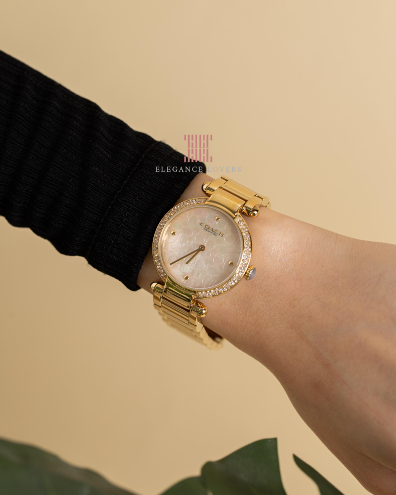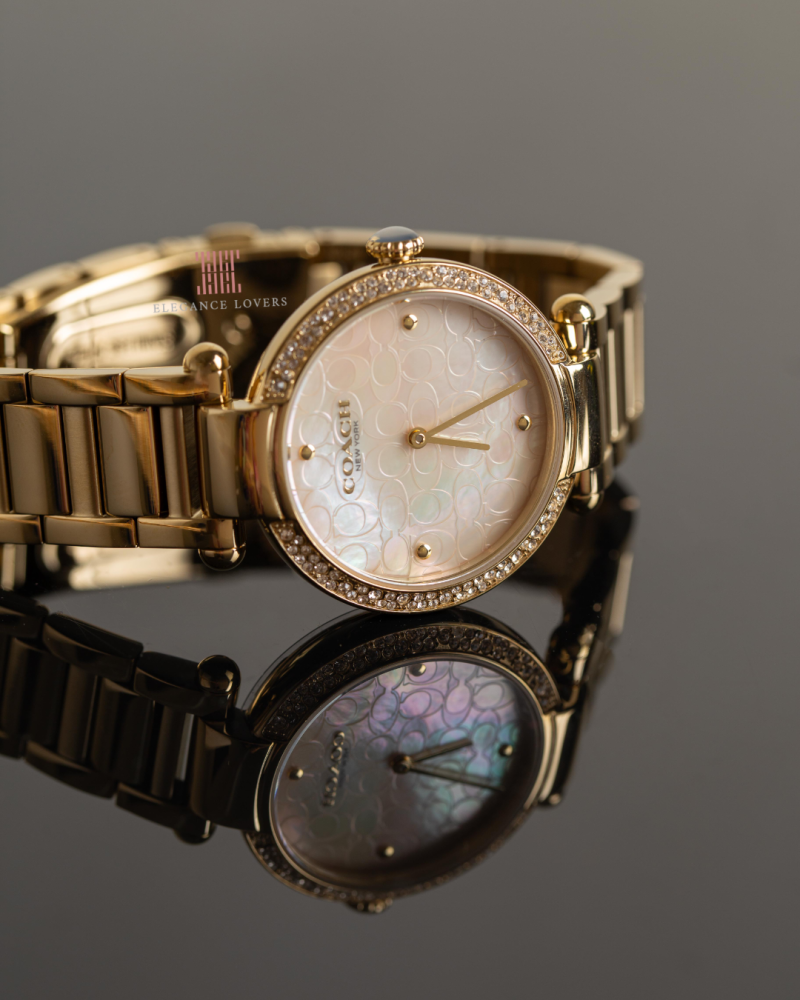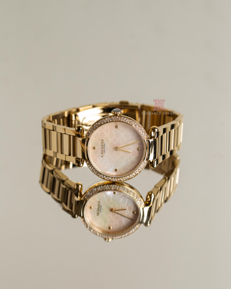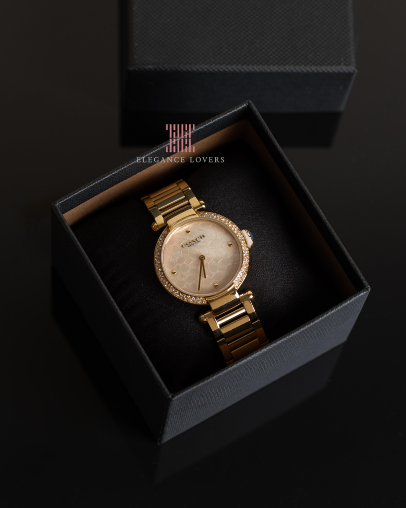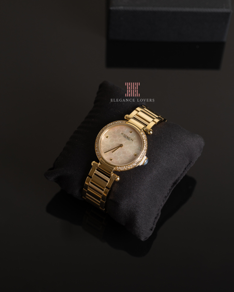 ساعة نسائية كريستال ماركة كوتش لون ذهبي مع ميناء صدفي سيقنتشر