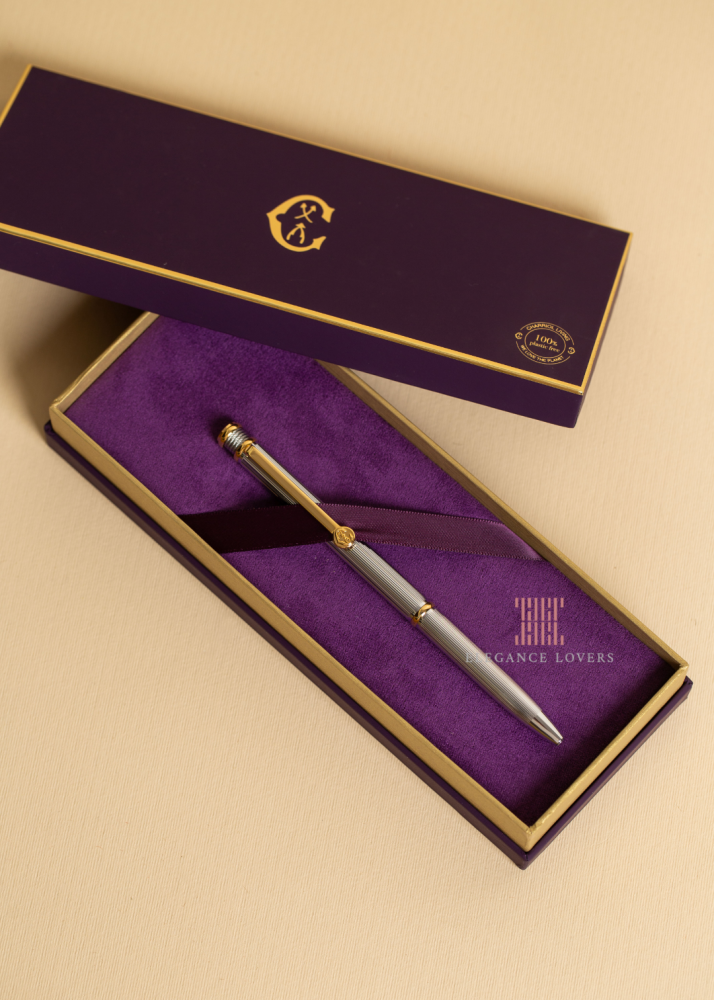 اكتشف الفخامة والتميز مع قلم شاريول Charriol Forever Silver & Gold Pen الأصلي 100% والذي يقدم توازن ساحر بين رقة الفضي ودفء الذهبي مع تصميم أنيق يليق بكل توقيع مميز.
