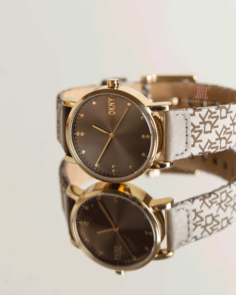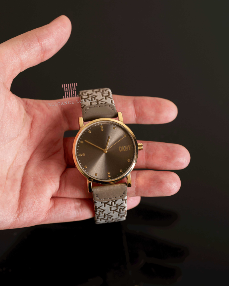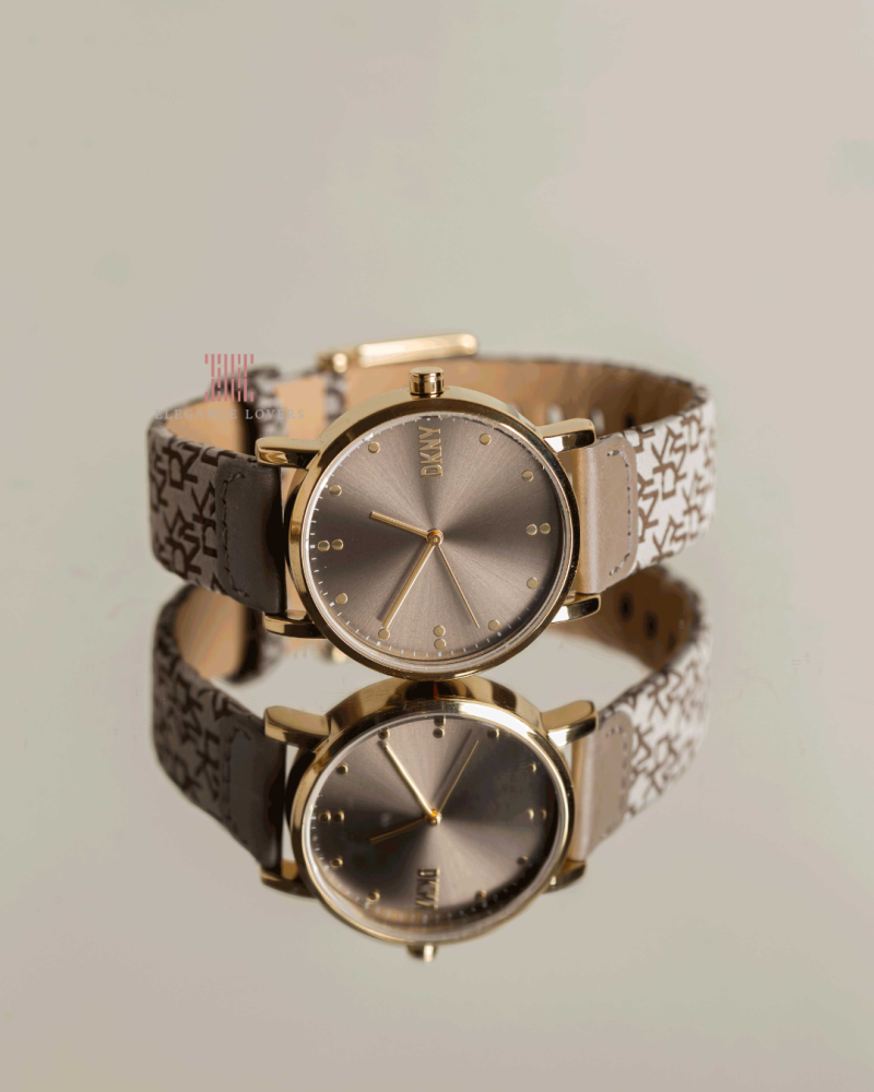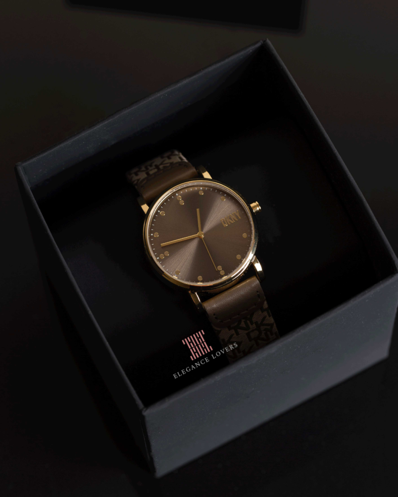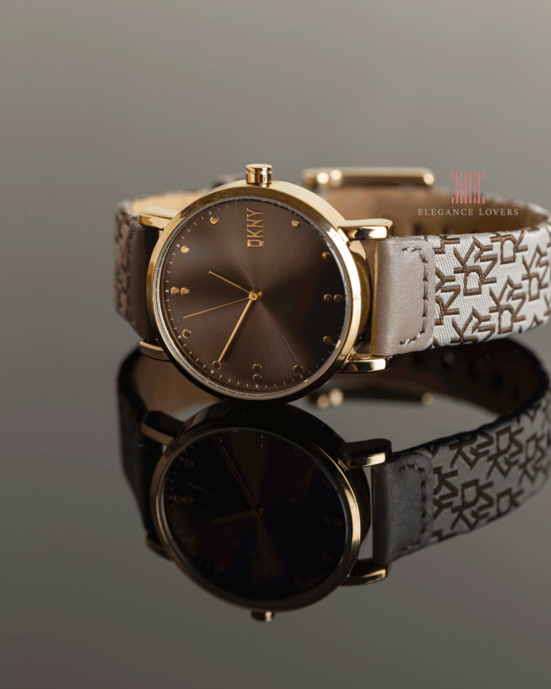 موديل أنيق وراقي من ساعات دكني، مزوده بسير مريح مصنوع من الجلد والقماش مطبوع عليه لوجو البراند بشكل عصري ومُلفت